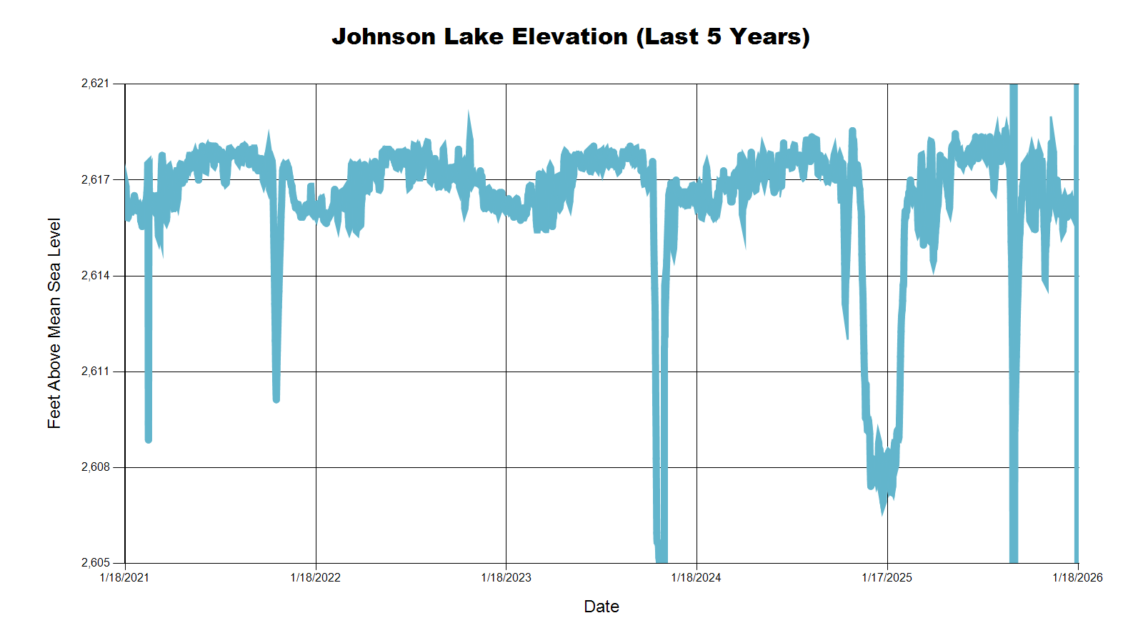 | Johnson Lake | 2,616.0 | 2,616.2 | 2,616.5 | 2,608.0 |