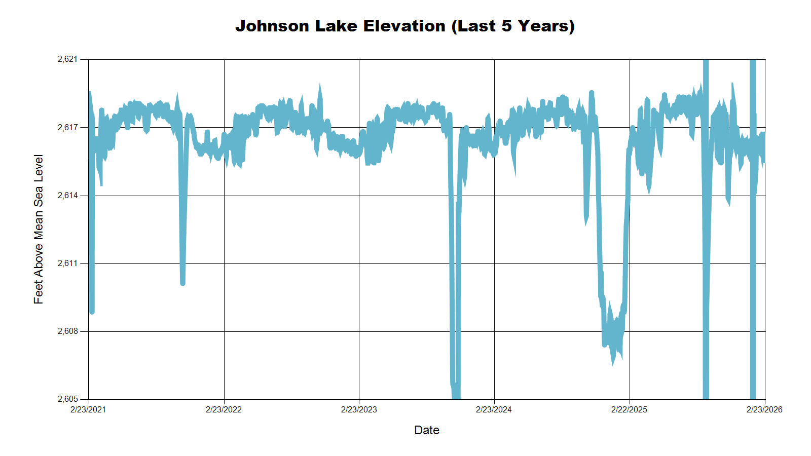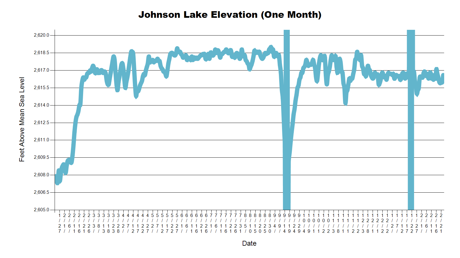 | Johnson Lake | 2,616.0 | 2,616.1 | 2,616.5 | 2,616.3 |
